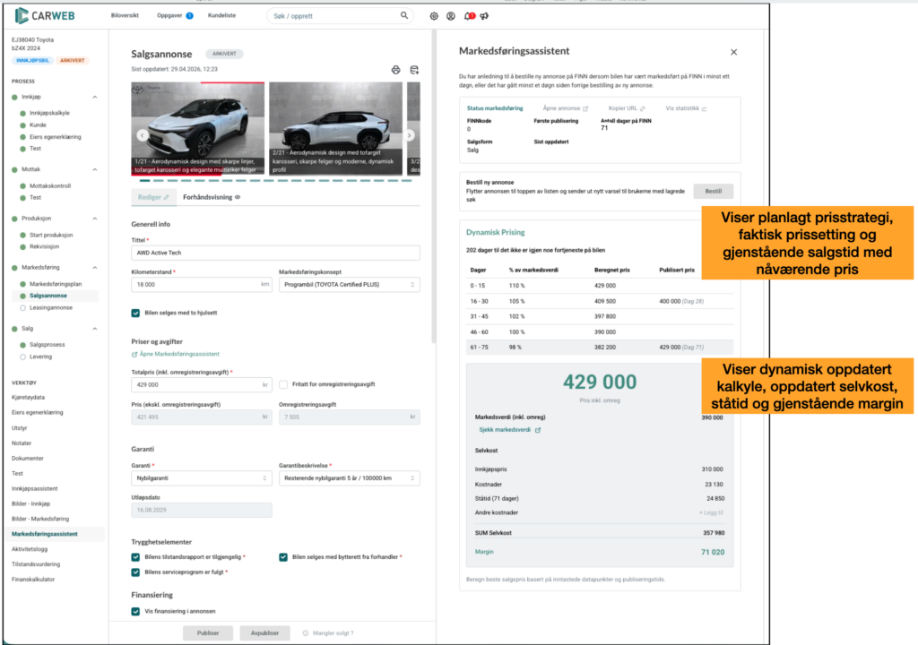 Dynamisk prising og oppfølging – ny funksjon inkludert i Carweb3 uten pristillegg. Selg bil raskere med bedre margin og kontroll.