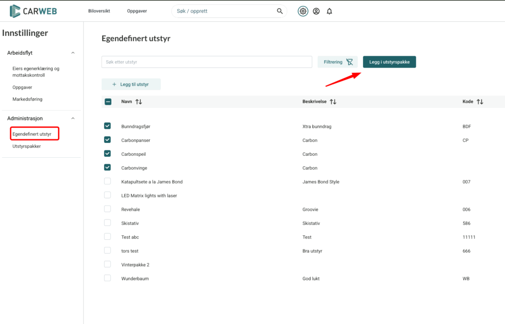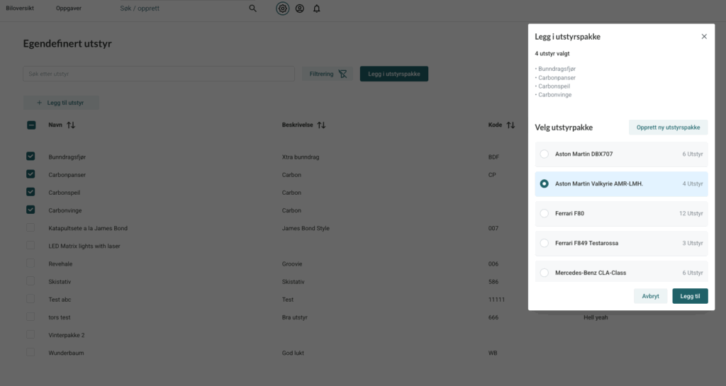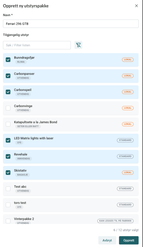 Nå kan utstyrspakker enkelt opprettes basert på tilgjengelig egendefinert utstyr i konfigurasjonen. Brukeren kan velge flere utstyrskomponenter og gi pakken et eget navn.
