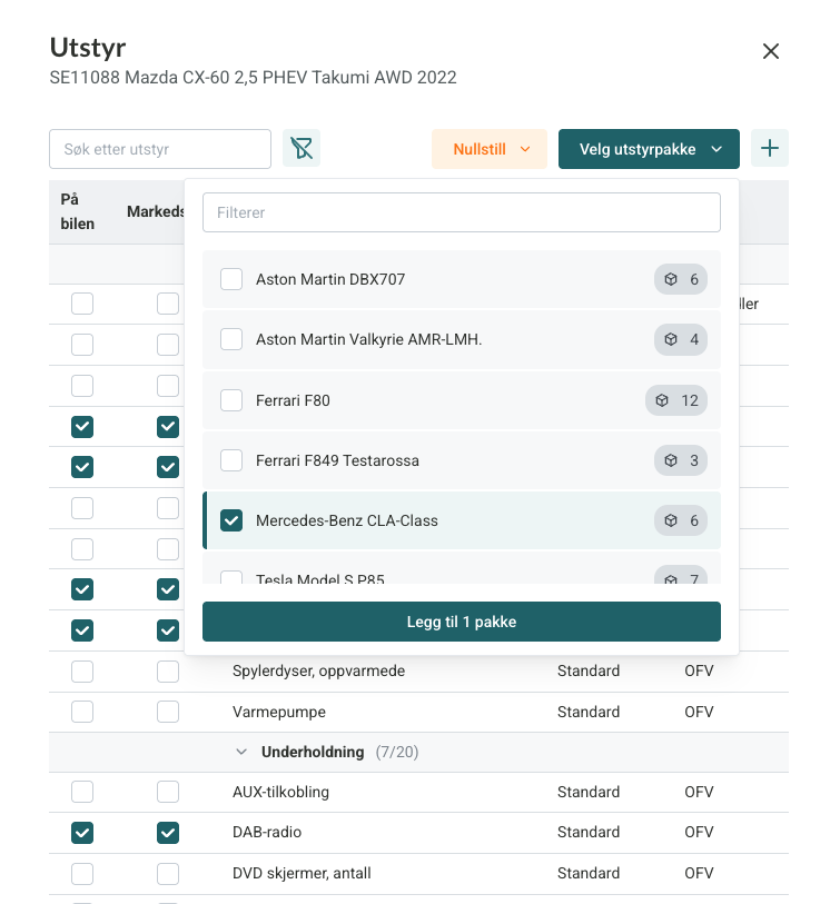 Det er nå mulig å oppheve hele utstyrslisten på en bil – både markedsført utstyr og fabrikkutstyr.